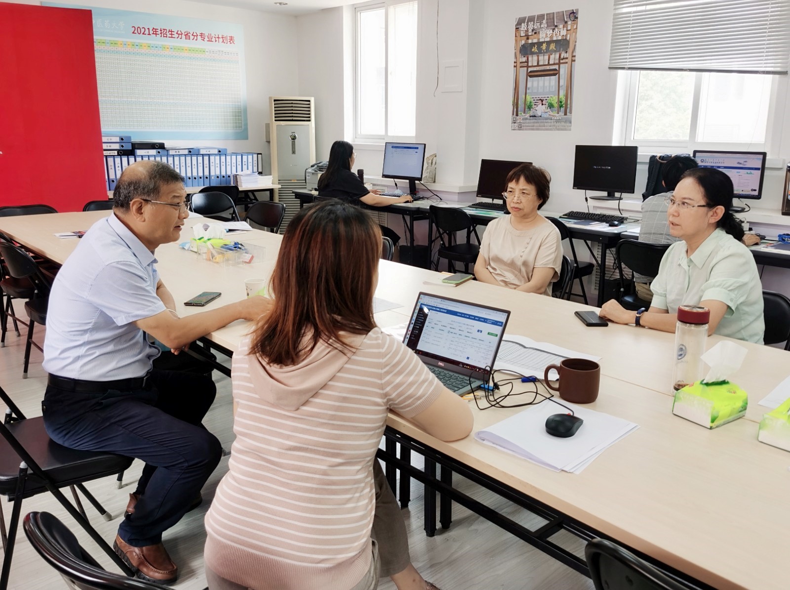 蒋朗朗书记首先了解了学校2021年本科生招生工作整体进展情况,对前期招生宣传工作表示肯定,同时就招生工作中的难点,与田润平处长和徐静副处长进行了深入探讨。蒋书记谈到,招生工作是一项很重要的工作,生源质量在一定程度上决定了中医药人才培养质量,招生与就业处要在前期招生宣传工作的基础上,做好今年的录取工作,为今后的人才培养及就业工作奠定良好基础。蒋书记强调,招生录取工作是一项政策性、程序性、原则性很强的工作,也是校内外关注度较高的一项工作,招生与就业处要压实主体责任,按照重点领域、关键环节廉政风险防控工作要求,严格执行有关规定,严守纪律规矩,确保学校招生录取工作公平、公正、公开。